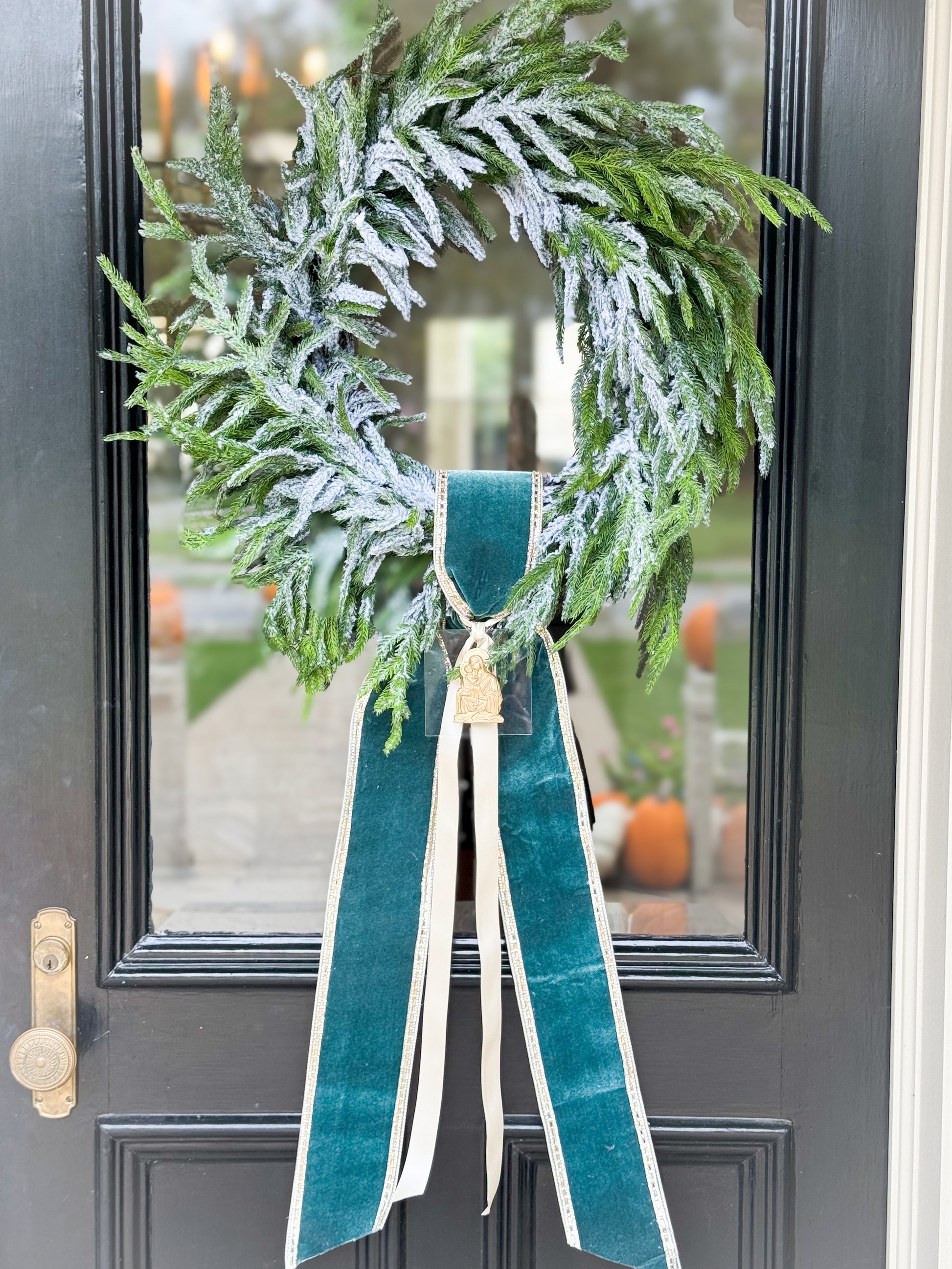 The Emmanuel 24” Real Touch Snowy Wreath With Layered Sash And Handmade Ornament
