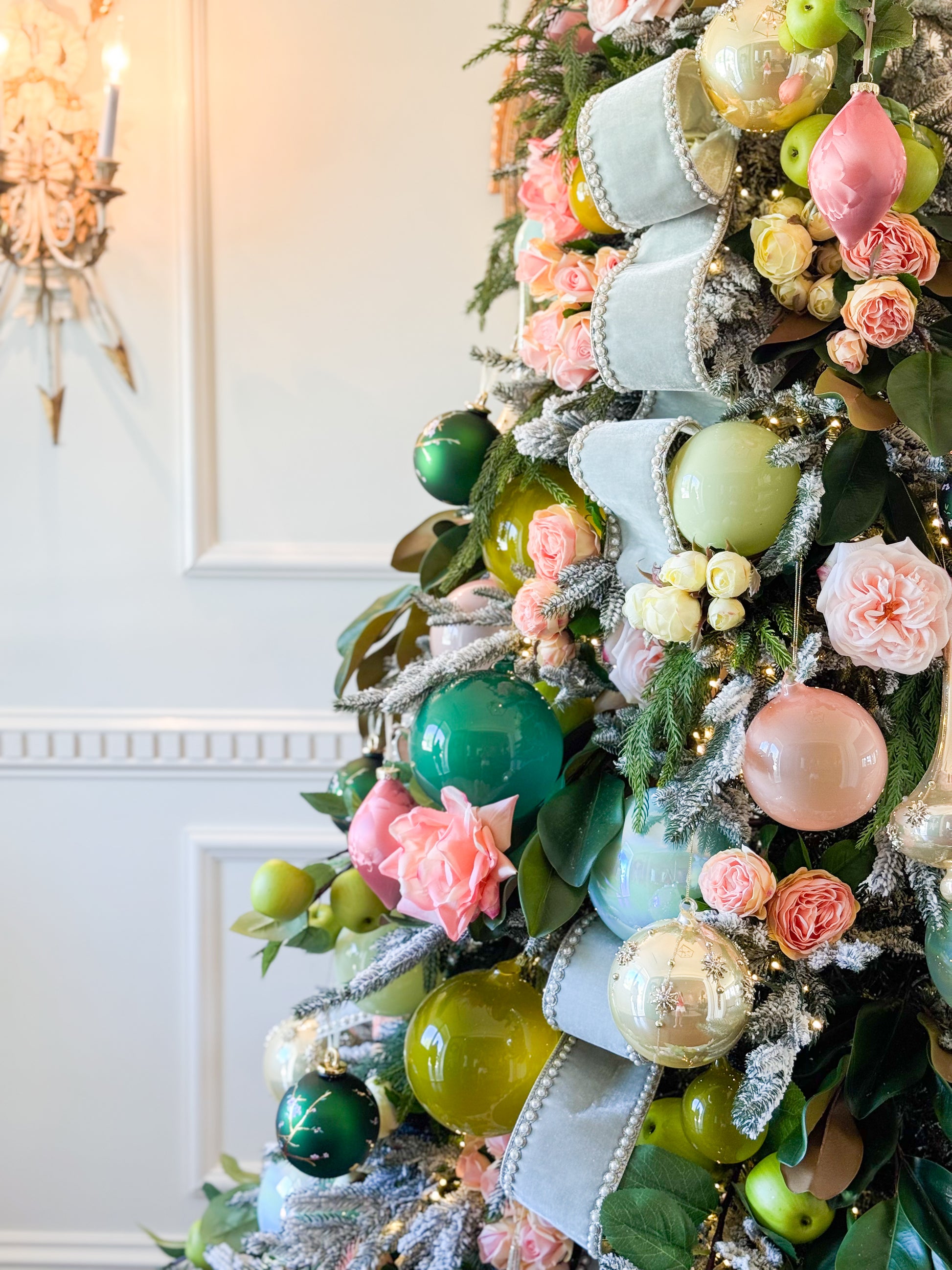 Soft frosted greenery pairs with velvet ribbon edged in pearl detail, cascading gracefully through the branches. Oversized glass ornaments in shades of emerald, champagne, blush, and chartreuse create a luminous jewel-like glow, while iridescent baubles add a whisper of magic. Handcrafted silk garden roses and camellias in soft pinks and creams bloom throughout the tree, mingling with clusters of lifelike green apples for a whimsical orchard-inspired touch.