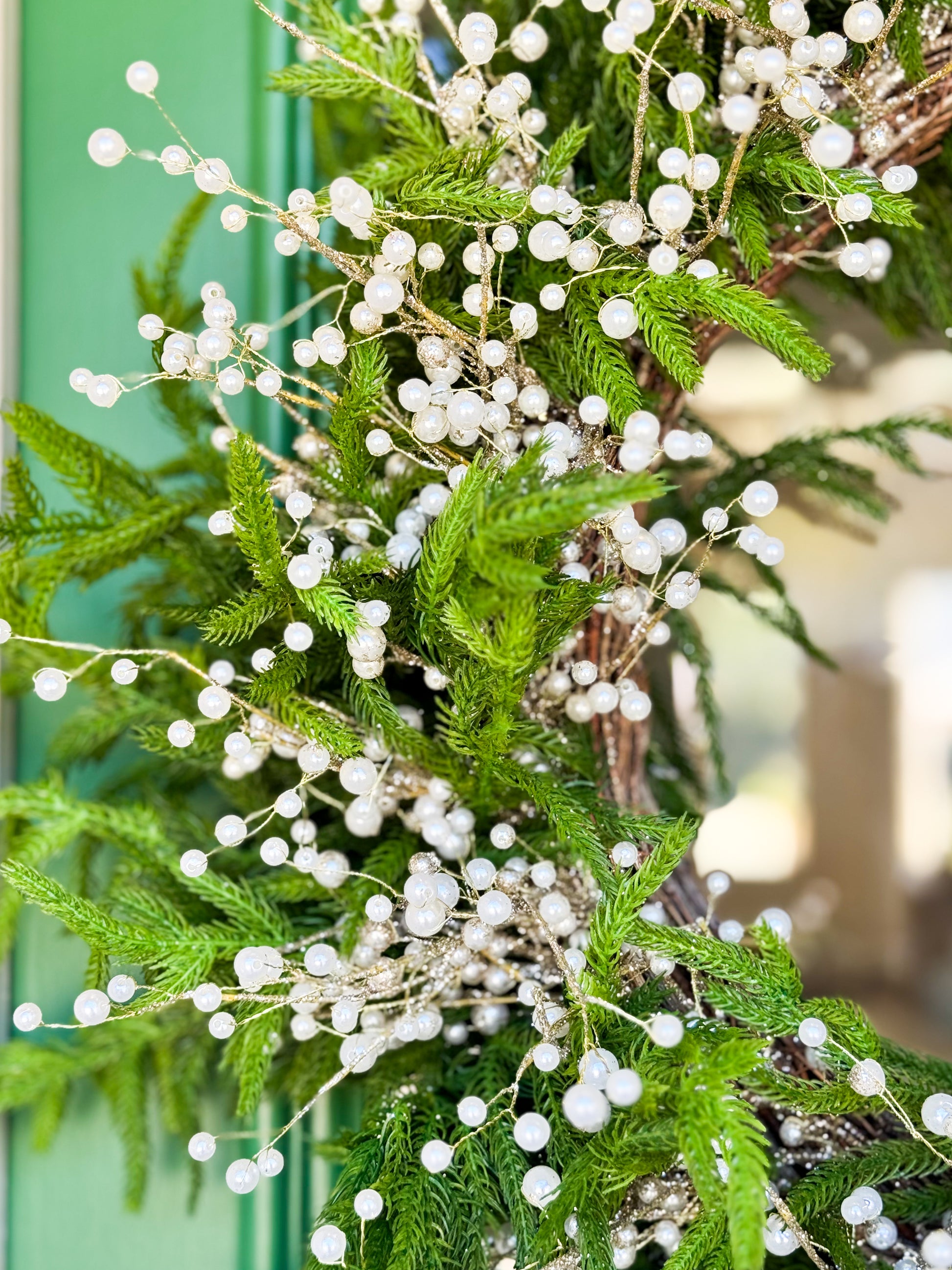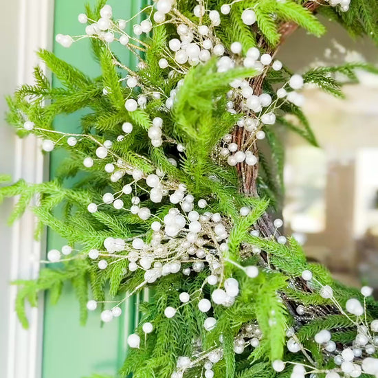Branches dripping in lustrous pearl clusters and real touch for is designed to exude luxury. Whether styled on a grand front door, mantel, or above a holiday tablescape, this wreath sets the stage for a truly enchanting Noël.