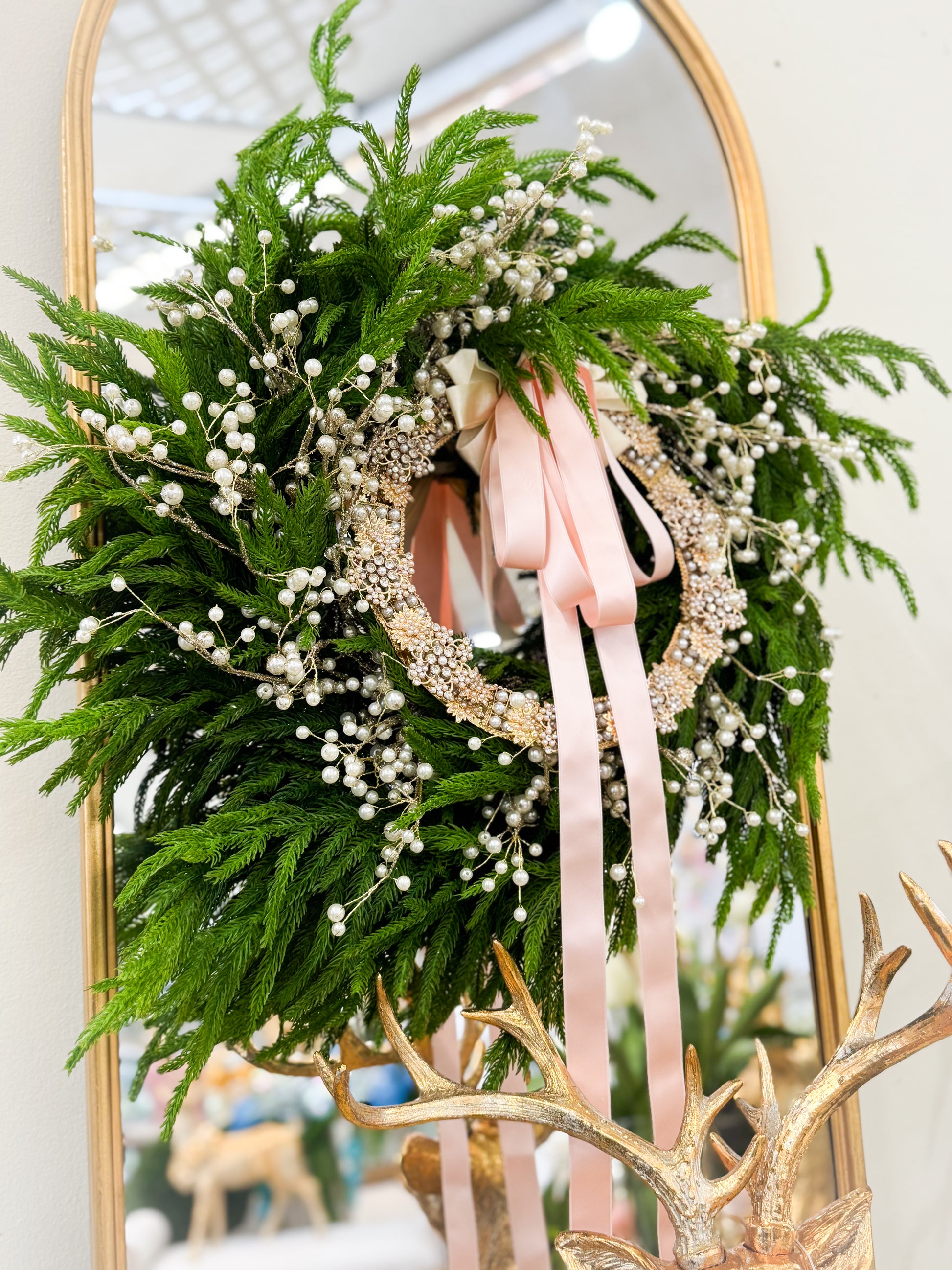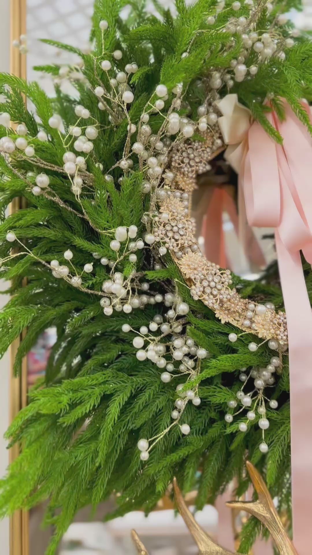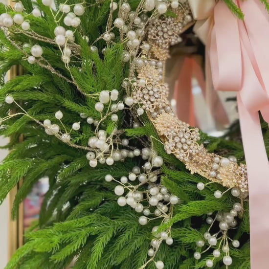 A timeless holiday masterpiece inspired by the grandeur of the French palace itself. The Versailles Noël Wreath pairs layers of lush, real-touch fir greenery with a radiant halo of hand-beaded pearls and jeweled floral accents — each detail shimmering like candlelight in a gilded ballroom.