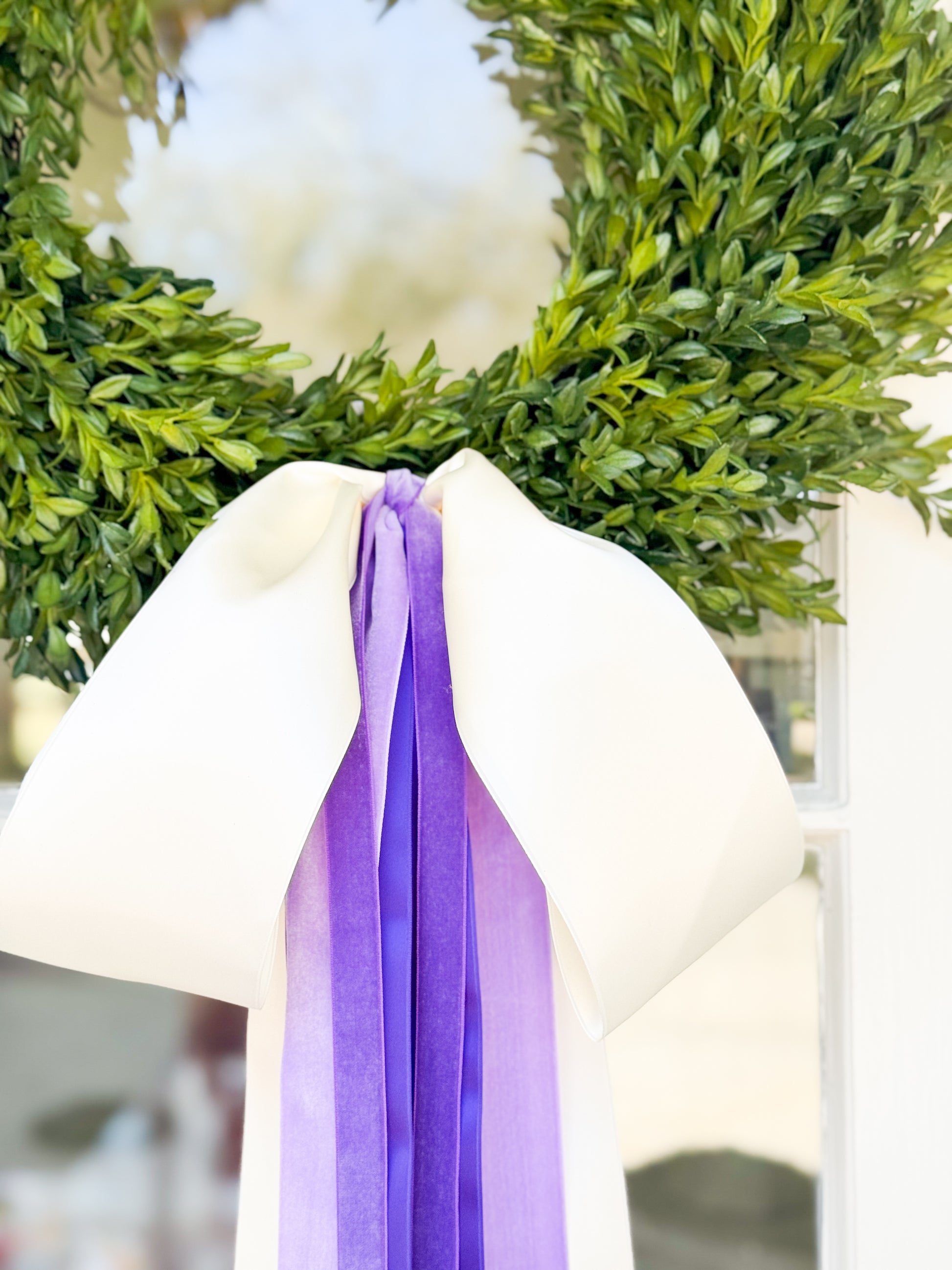 The White And Lavender Grace Tea Leaf Wreath With Satin Layered Bow And Handcrafted Cross Ornament Is The Definition Of Beauty This Holy Season. It’s Perfect For Lent, First Communion, Confirmation, And Baptisms