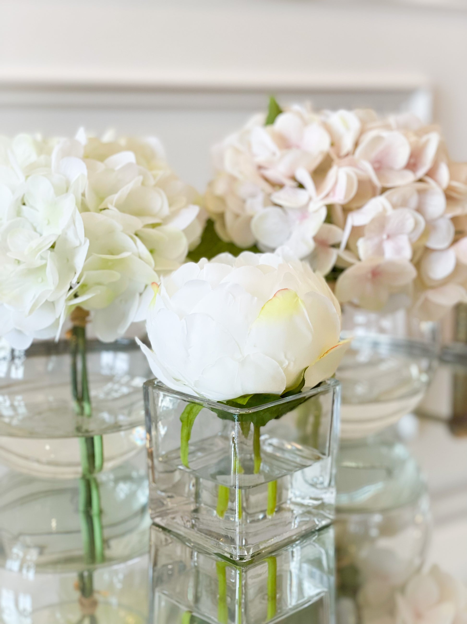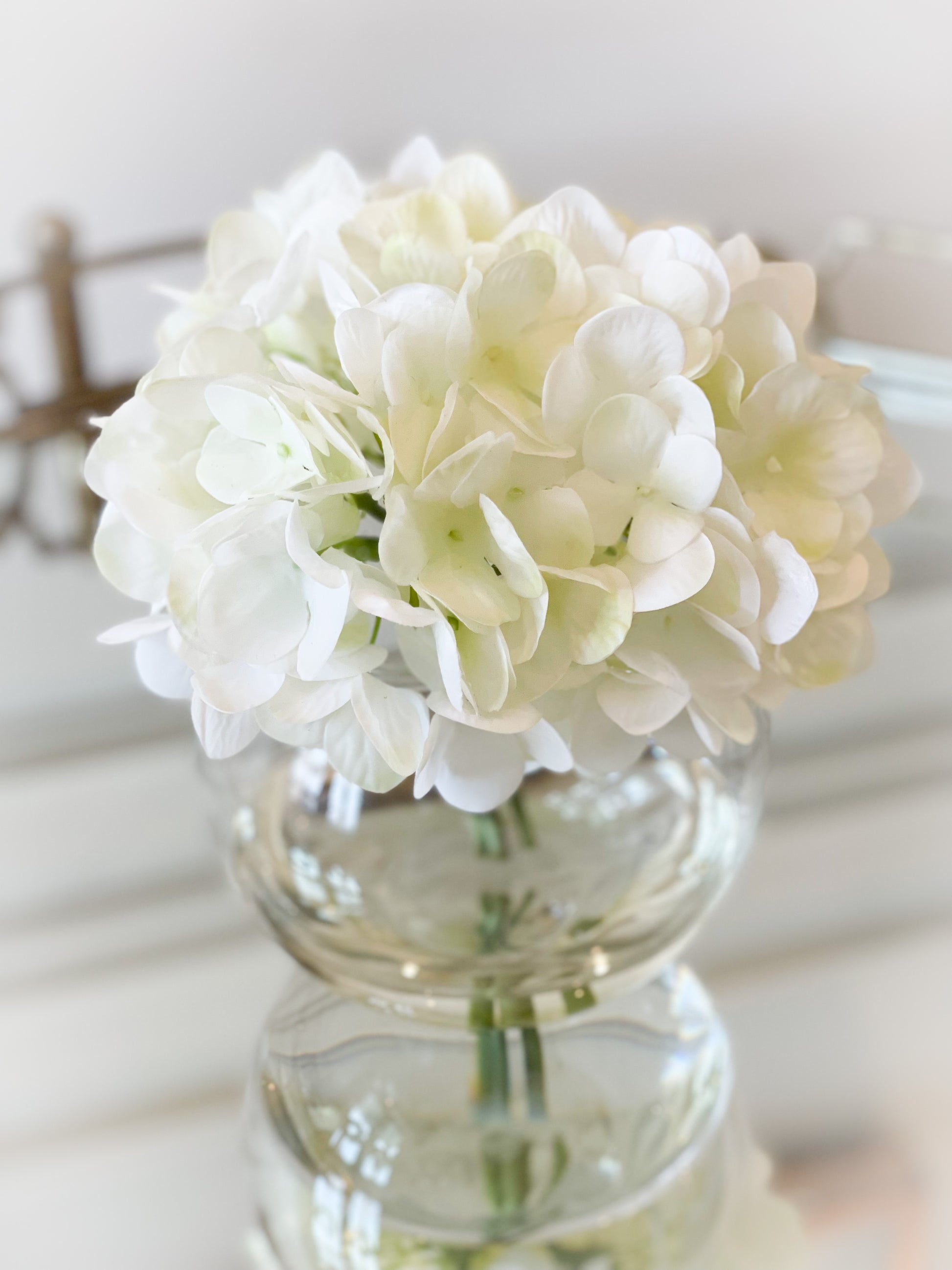 White Hydrangeas In Glass Vase With Acrylic Water