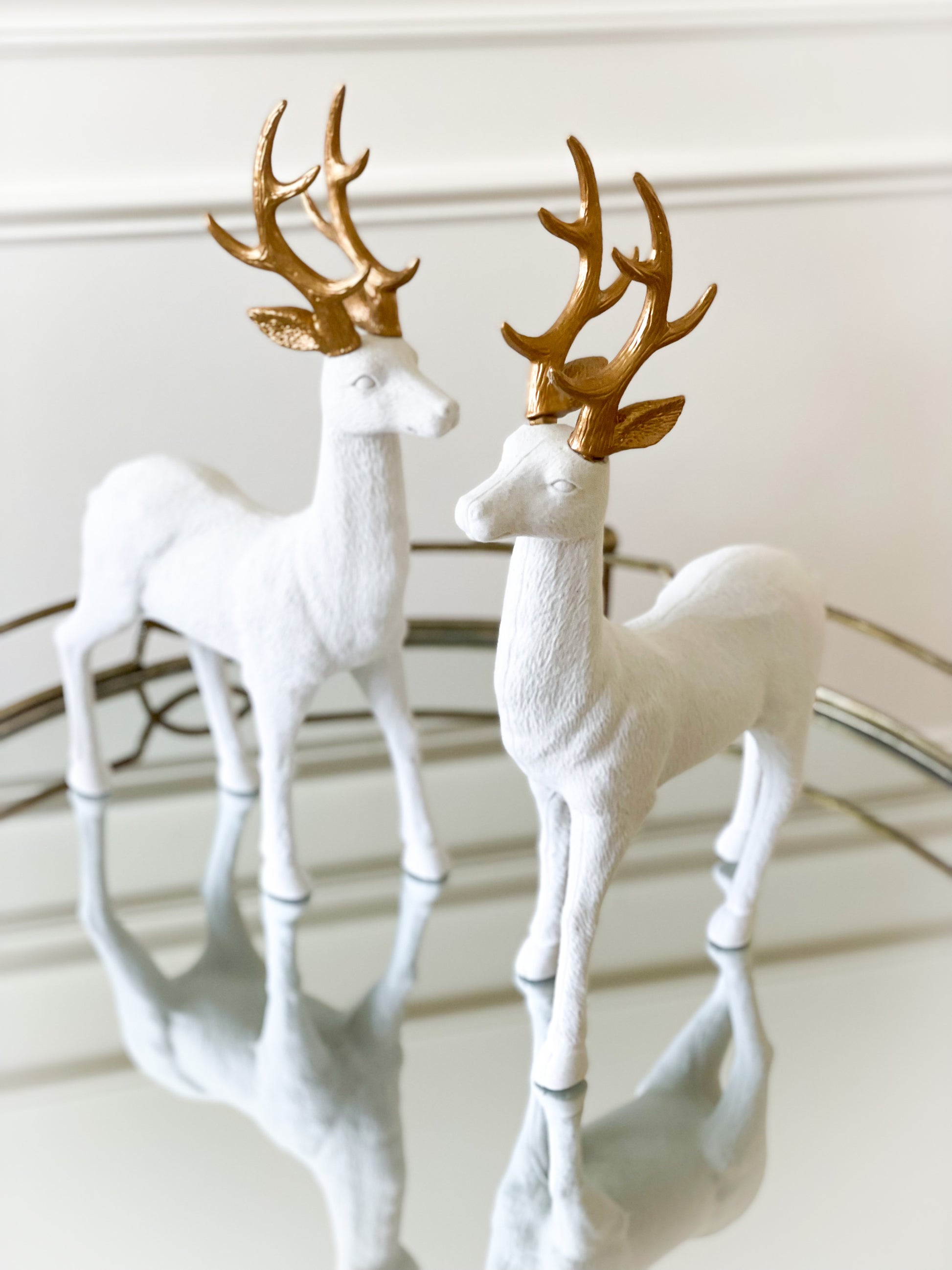 Set of 2 White Velvet Reindeer With Gold Antlers
