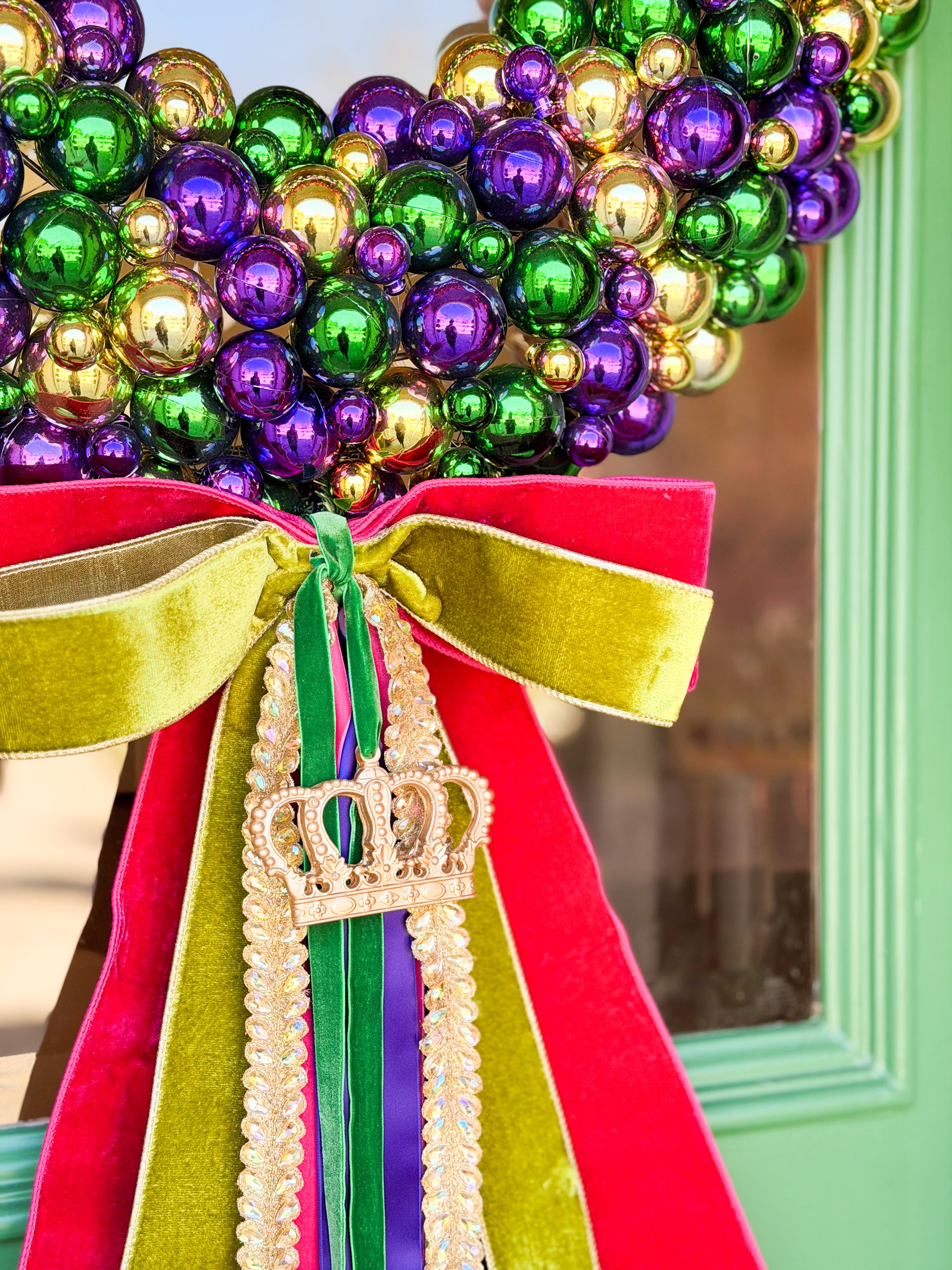 This Mardi Gras ball wreath features a lush mix of high-shine metallic ornaments in traditional purple, green, and gold, layered to create rich texture, depth, and irresistible sparkle. The wreath is finished with a dramatic layered velvet hot pink and chartreuse bow in coordinating jewel tones and crowned with a handmade gold crown ornament, symbolizing the spirit of Carnival royalty.